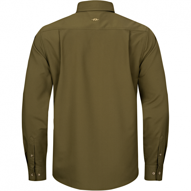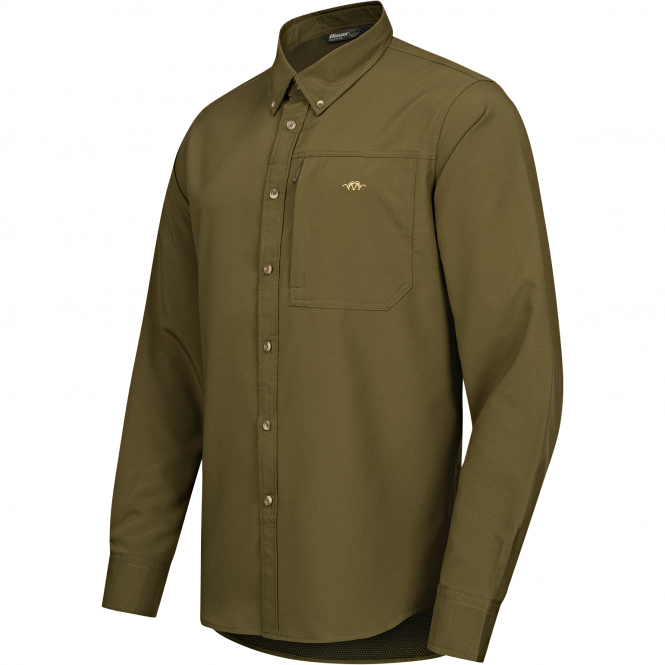 A highly breathable functional shirt. Whether sweaty stalking in warm temperatures or strenuous climbs, the quick-drying Airflow shirt absorbs moisture and wicks it away from the skin. Featuring a button-down collar and a zipped chest pocket. Color: olive.