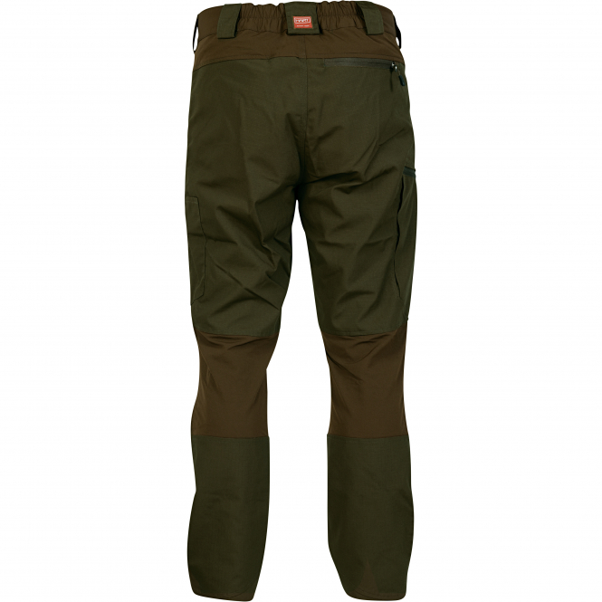 Sporty and ergonomic hunting or outdoor trousers, with elastic inserts on the upper part and on the back of the knees. Main fabric with water-repellent rip-stop structure in cotton blend. 6 pockets: 2 upper pockets, micro pocket with zip, cargo pocket with zip, knife pocket,