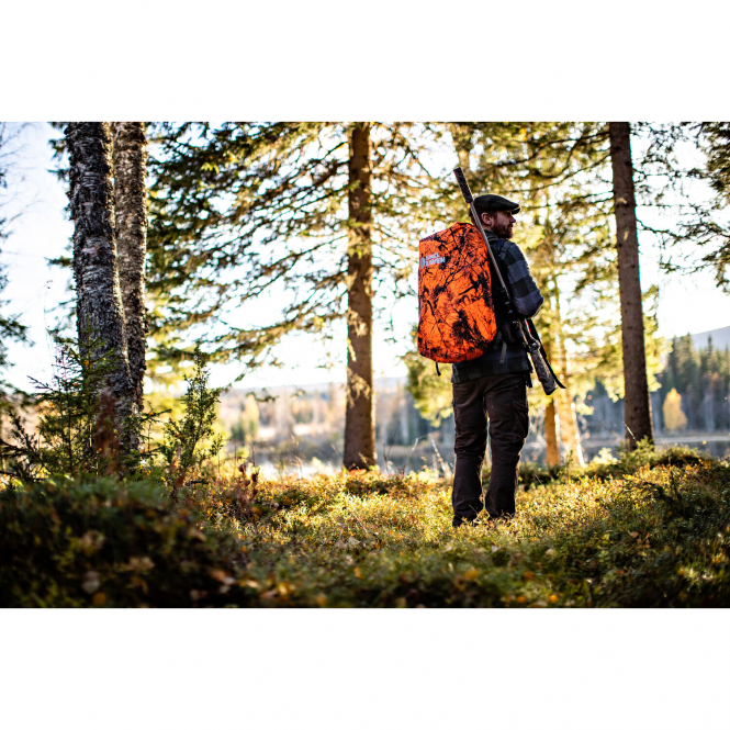 Rain cover with taped seams suitable for rucksacks with 16 to 28 litres, also with attached side pockets. The safety colour with camouflage pattern makes it clearly visible to other hunters, but difficult to spot for wild animals. Thanks to the elasticated drawstring, the cover fits perfectly and the hook ensures that it is securely attached to the rucksack so that it is not blown away in strong winds. The white inside can be turned inside out when hunting in the snow. Colour: orange.
