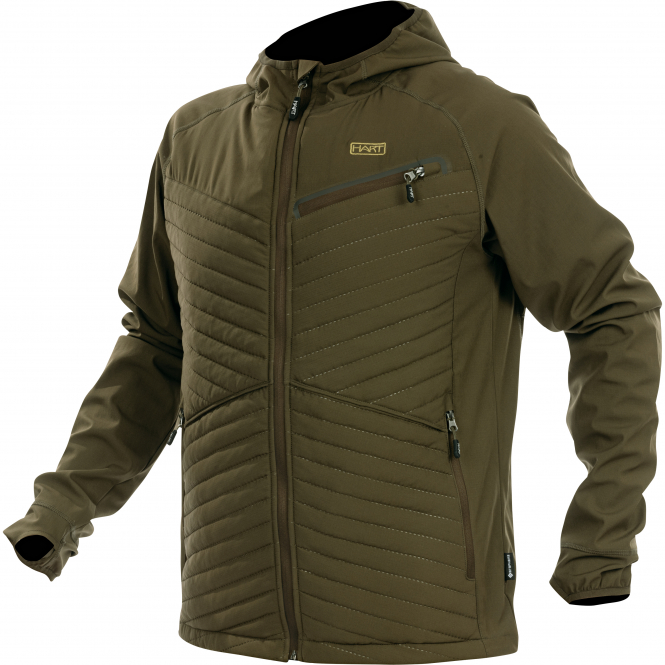This hybrid hunting jacket is characterized by a low-noise 2-way stretch fabric with a graphene layer on the inside, which helps regulate body temperature. The jacket is divided into two sections: While the front and back sections are padded with HDI insulation, the sleeves and head area consist of a single layer, allowing unrestricted freedom of movement. Two easily accessible zippered pockets provide secure storage for smaller items. In addition, there is a zippered chest pocket and a multimedia port on the inside, which makes it easy to connect headphones when using a radio or cell phone. The elasticated cuffs are equipped with a thumb opening to improve the fit of the sleeves. Depending on the temperature and climate, the jacket can be worn as outerwear or as an intermediate layer. The combination of insulation, freedom of movement and well thought-out features makes this hybrid jacket particularly suitable for stalking. Dark Oliv.