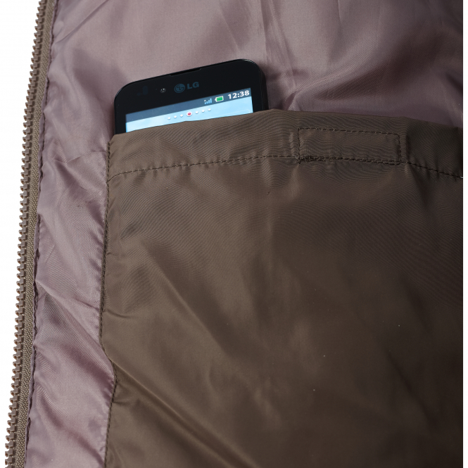 Elegant ladies quilted jacket in straight cut with microfiber trim on the shoulders and shoulder-chest area to the right. With two zipped pockets, high collar and buttoned cuffs that are trimmed with microfiber fabric. Hem in the back area is unbuttonable for more freedom of movement. Colour: dark olive / brown.