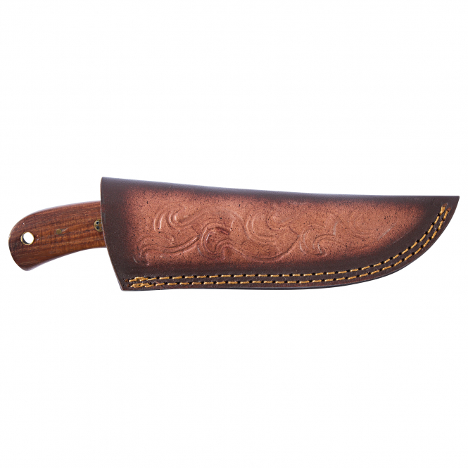 The handle is made of wood and stag horn. Includes leather sheath. Blade length: 9 cm. Total length: 21 cm. Weight: 171 g.