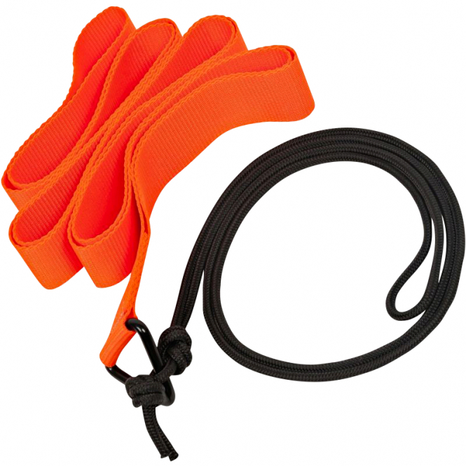 Noiseless game recovery harness with rope sling and 40 mm wide shoulder strap. The knot in the strap is used as a handle. With sewn-in rope loop with a diameter of 5 mm.