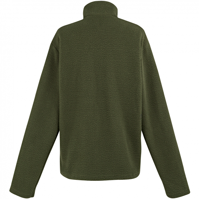 Fleece jacket made from polyester Borg fleece (270g/m²). With stretch edging on the collar, breast pocket with zip in nylon look and two side pockets. Colour: dark khaki.
