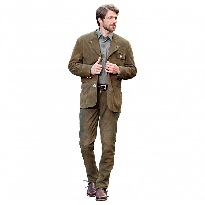 This elegant leather jacket with a straight cut combines classic style with hunting charm. The small stand-up collar and lapels are fastened with hunting-style buttons in a wood look, which emphasise the natural look. Whether for festive occasions or with jeans for a sporty look, this jacket is a high-quality companion for a wide range of occasions.