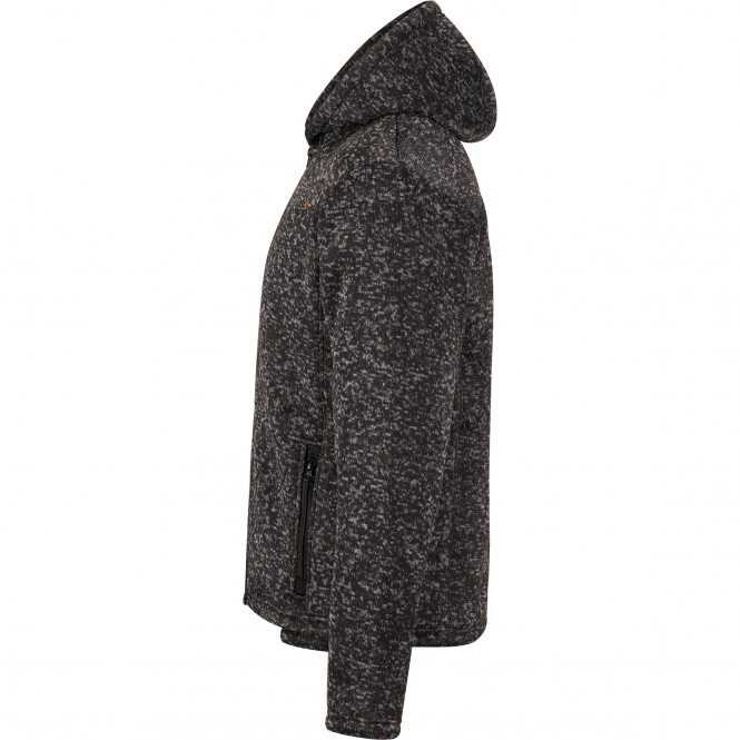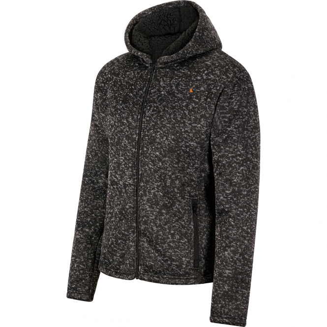 Super warm knitted fleece jacket with teddy lining. Practical hood and two side pockets with zippers. Colour: black melange