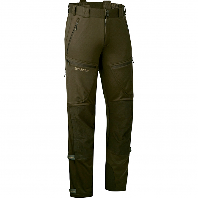 The Excape softshell trousers have an elasticated waist and removable braces for a comfortable and secure fit. With two front zip pockets and two ergonomic thigh pockets, these trousers offer plenty of storage space so that nothing stands in the way of your outdoor adventure. Thanks to the water-repellent finish, your valuables stay dry. There is also a hidden knife pocket on the inside and a back pocket with a waterproof zip, providing all the storage space you need for a day out in the countryside. The trousers have pre-shaped knees with space for knee pads and stretchy reinforcement in the seat and lower leg areas to keep these areas dry without restricting movement. Adjustable elastic bands with Velcro fasteners on the lower legs are another functional feature. The Excape Softshell Trousers are soft, quiet and ideal for exciting excursions.
