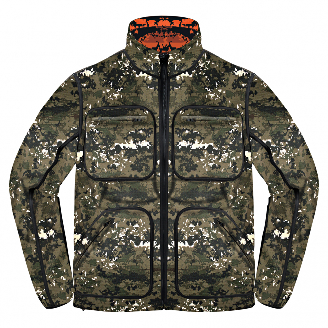 The reversible jacket with membrane combines functionality, visibility and sophisticated design. It impresses with its practical reversible function: while one side in the modern phantomX digital print ensures optimum camouflage in the great outdoors, the other side in bright orange offers maximum visibility and therefore increased safety, for example on social hunts or work assignments. The integrated membrane with a water column of 8,000 mm provides reliable protection against rain, while the breathability of 3,000 g/m²/24h ensures a comfortable fit even during physical activity. Both sides of the jacket each have two breast pockets, which are lined with breathable mesh fabric. Two side slit pockets with mesh lining provide additional storage space and cosy warmth for the hands. A patch sleeve pocket with zip allows quick access to important items. The functionality is complemented by elasticated loops on both shoulders, which are ideal for securing equipment. The orange side is particularly visually appealing thanks to the contrasting black bindings, which not only set accents but also provide additional durability.