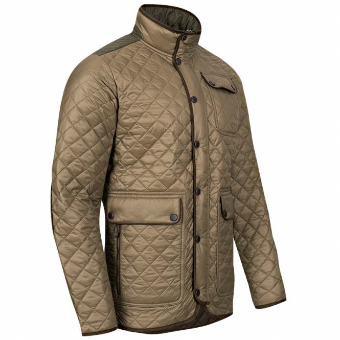 The torso area and sleeves of the jacket are quilted in a diamond pattern. With 1 flap pocket at chest height, 2 flap and zip pockets at the bottom, suede piping on the upper collar, on the wind flap, on the cuffs and on the lower hem. Colour: khaki.