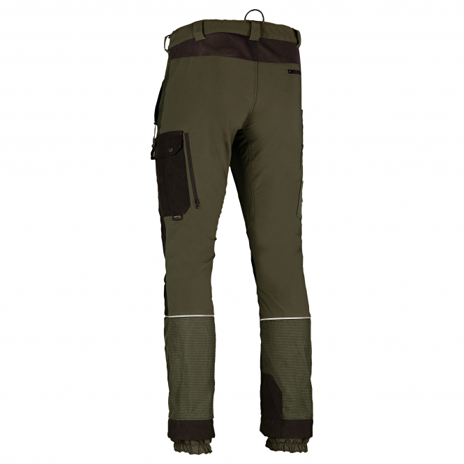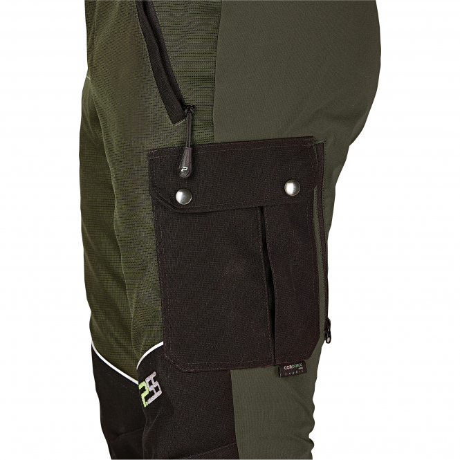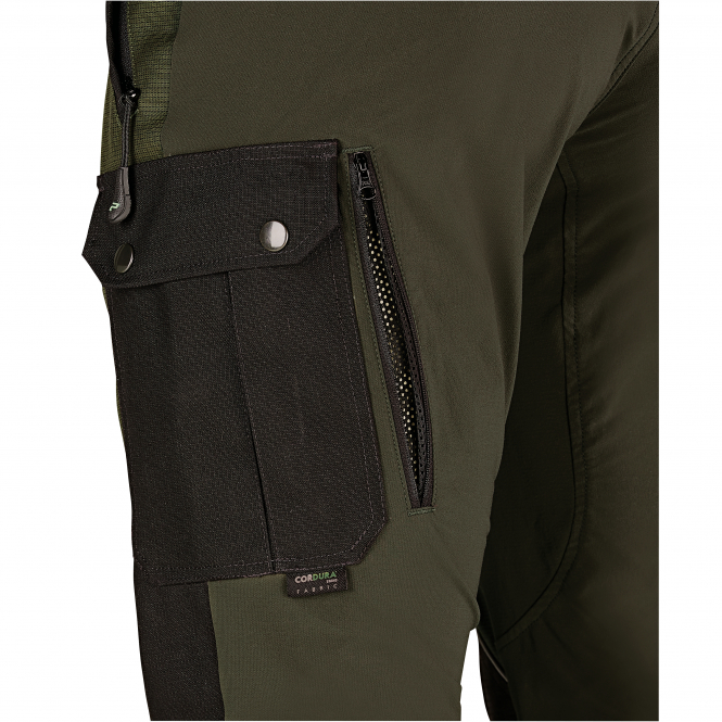 An outdoor pants made of high quality materials for maximum robustness and comfort. Fulfills professional demands without compromise. Extremely high freedom of movement and an extremely low weight, combined with robust Cordura® and waterproof and breathable outer fabric. These outdoor pants have removable gaiters with shoe slings that allow them to be fixed firmly to the shoe. This prevents the pants from sliding up, for example, through thorns and brush. With extra long zipper ventilation outside the buttocks area. Side pocket with integrated smartphone pocket. Ventilation grids made of Cordura® on the entire waistband.