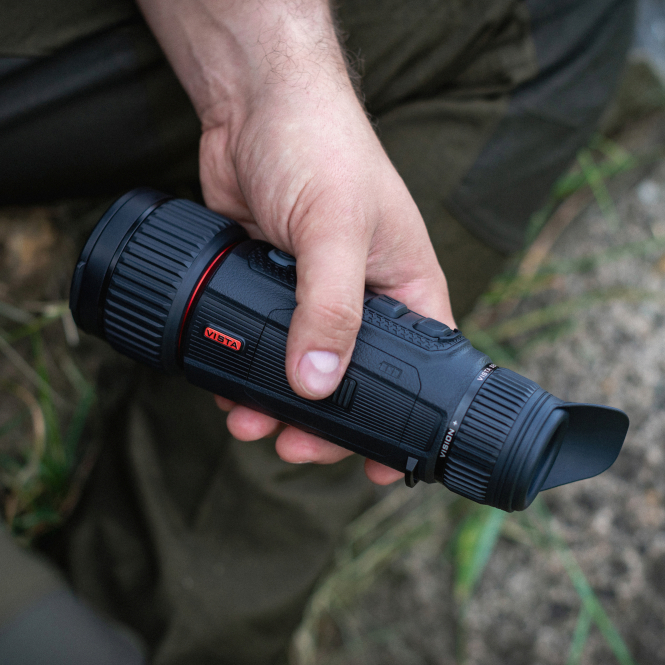 Operation of the Vista devices remains pleasantly unobtrusive: noiseless buttons enable discreet operation, while the rotating eyecup shields out stray light. The non-slip TPU synthetic leather coating ensures a secure grip, even during long periods of use. With generous storage space, robust protection against dust and water (IP67) and a wide operating range from -20 °C to +50 °C, the Vista thermal imaging handheld devices are reliable companions for a wide range of outdoor activities.