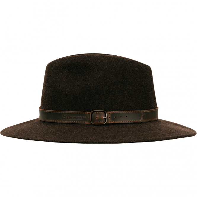 This Merino wool hat is water-repellent, breathable and easy to care for. With embossed Blaser logo on the hat band and a brass buckle. Color: brown.