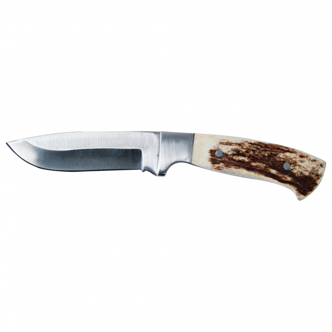 The handle is made of stag horn. Includes leather sheath. Blade length: 10 cm. Total length: 22.5 cm, weight: 213 g.