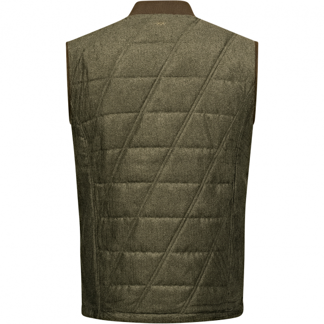 Padded vest made of single-layer vintage fabric, mix of horizontal and vertical decorative quilting, insulation 150 g, suede inserts on the arm openings and pocket openings, 2 side pockets with zips, ribbed collar, taffeta lining, 1 inside chest pocket, Blaser acanthus neck label. Color: olive.