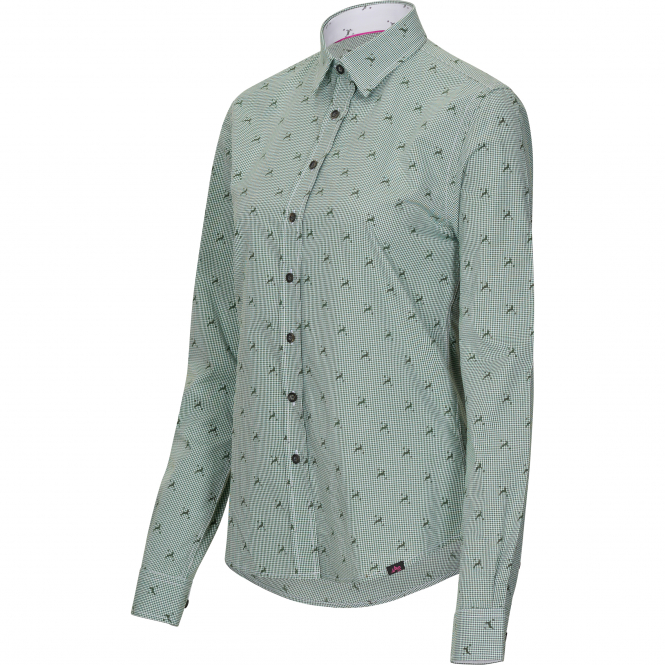 Versatile, combinable slim fit blouse in a check design with little deer. The figure-hugging blouse impresses with feminine elegance and loving details such as the pink ribbon in the collar and the coloured buttons. The inner fabric in white with little deer is an eye-catcher that underlines the modern design. Colour: olive.