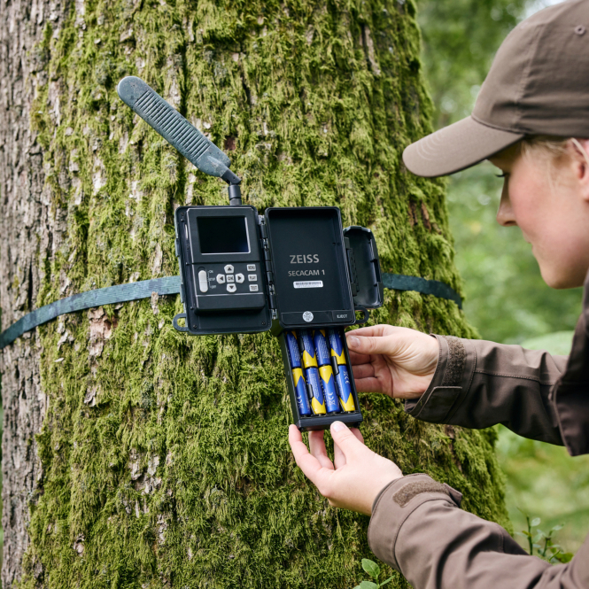 The weatherproof housing with precise sealing reliably protects the camera from rain, snow, heat and hail, making it suitable for permanent outdoor use. The Secacam 1 is fully compatible with the ZEISS accessory system, including various mounts, power supplies, solar panels and protective housings, and can be flexibly adapted to different territory situations. A fast motion sensor with a trigger time of approximately 0.35 to 0.45 seconds reduces motion blur to a minimum. Automatic flash adjustment prevents overexposure and saves energy. The practical battery magazine also allows for quick battery replacement directly in the field.